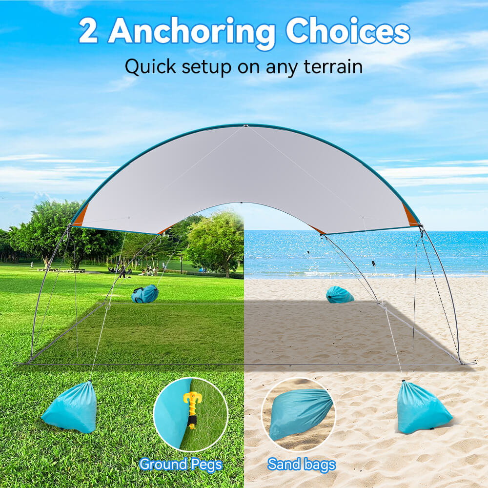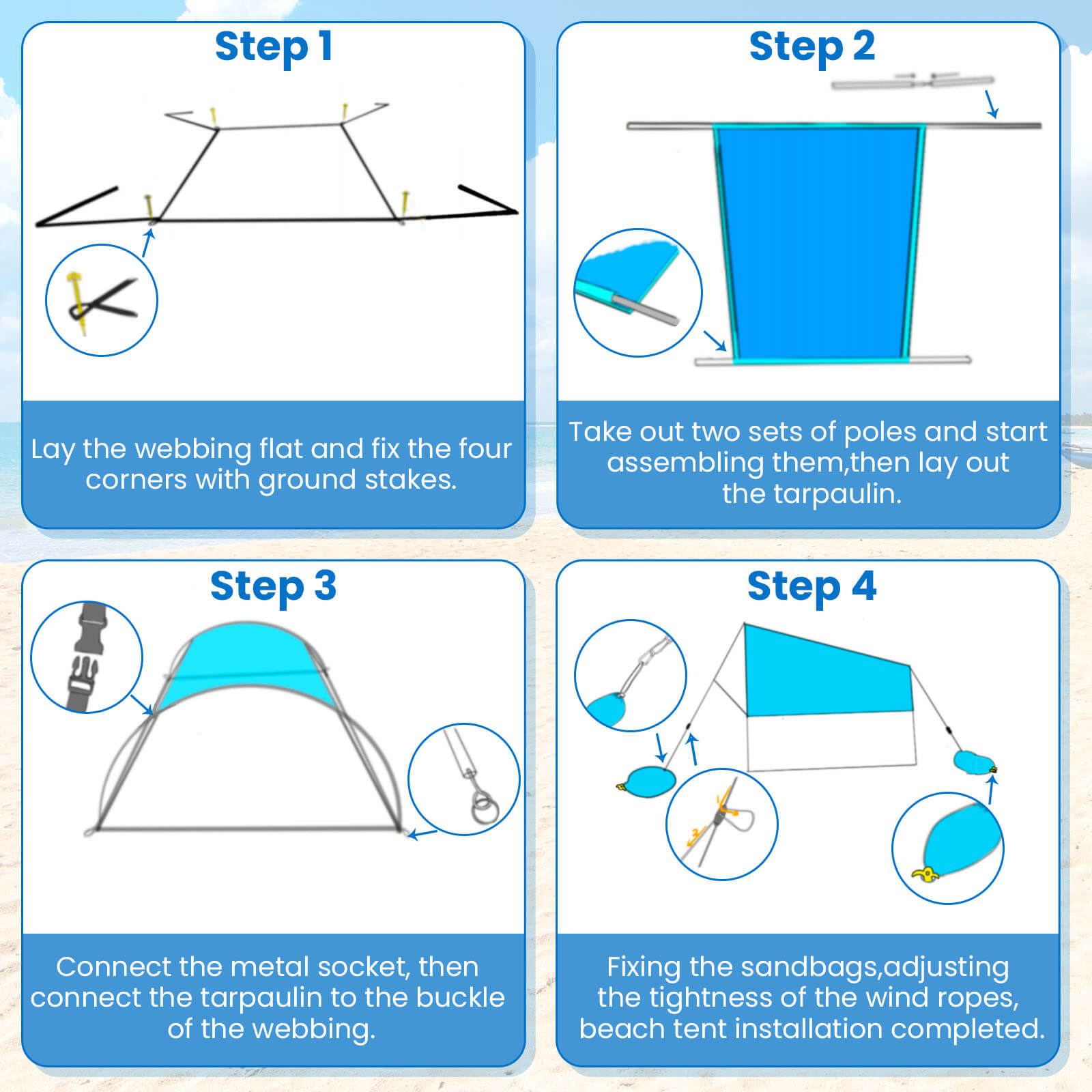 • Veilig Anti-Zand Verankeringssysteem: Versterkte hoeken met zandzakken en haringen zorgen voor een stabiele verankering op zandige oppervlakken. Dit systeem houdt de schuilplaats stevig op zijn plek, zelfs op winderige dagen aan het strand.