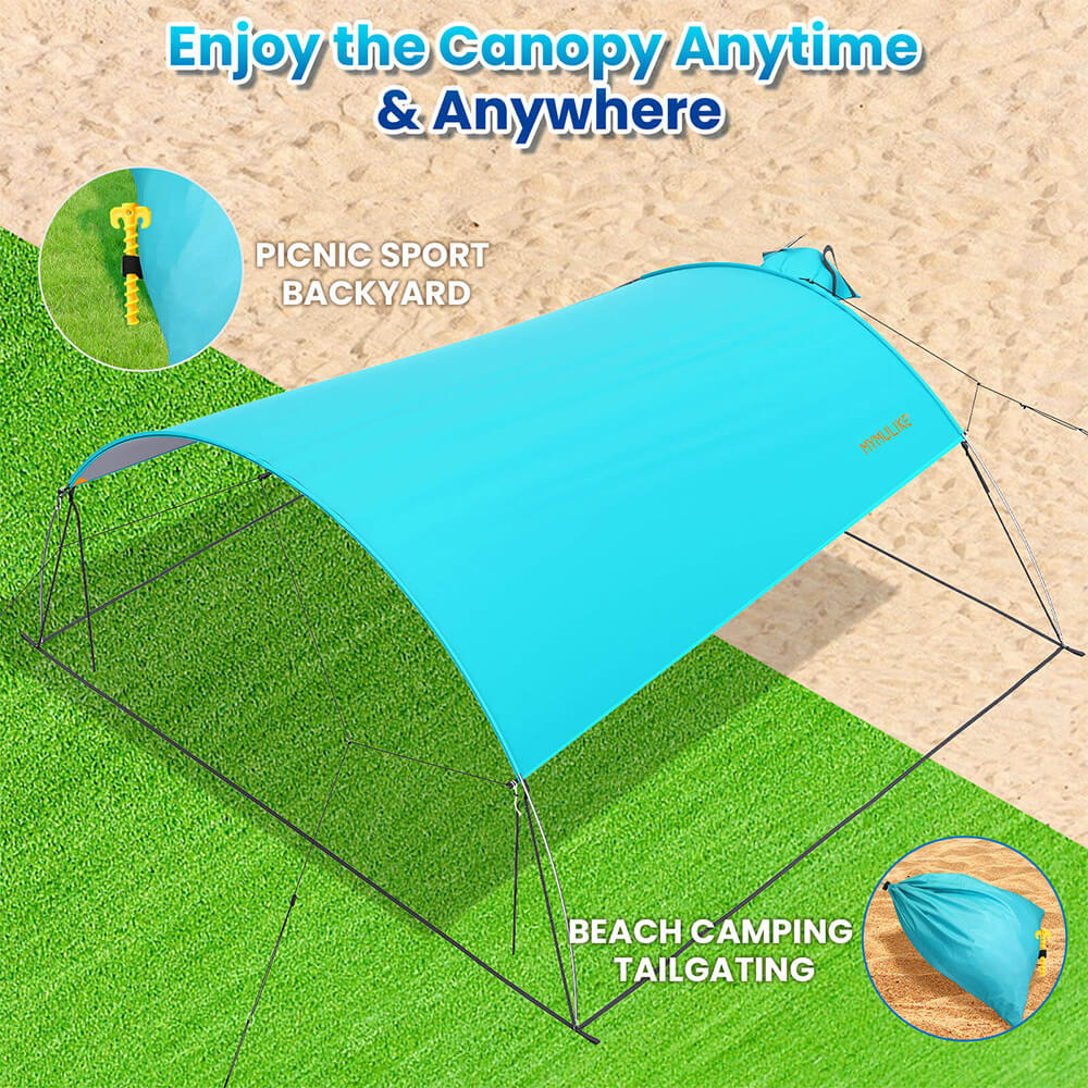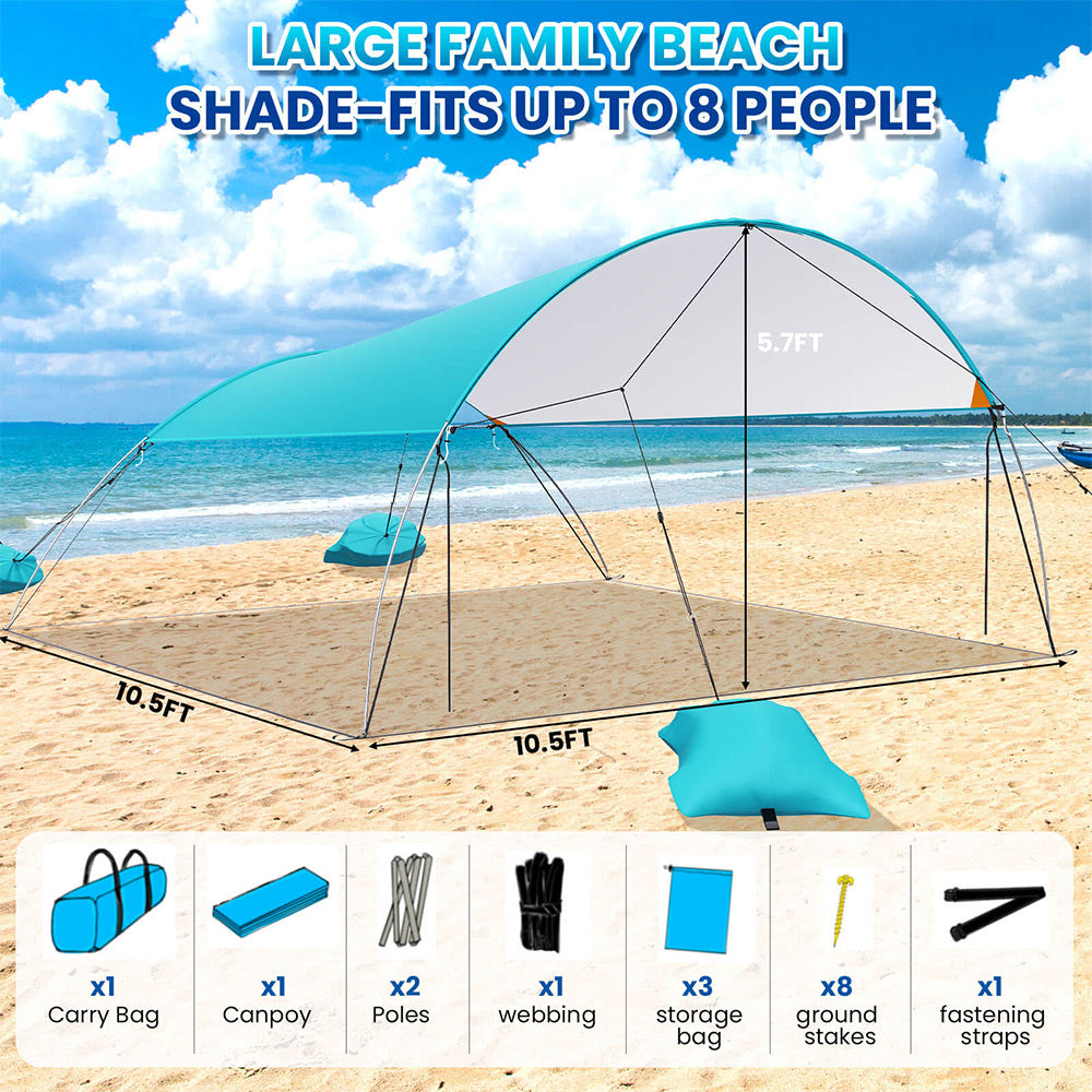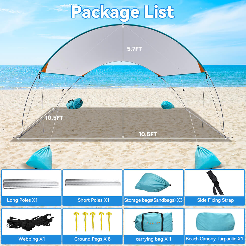 • UPF 50 en Zandbestendig Duurzaam Materiaal: Gemaakt van duurzame gerecyclede materialen, blokkeert de schuilplaats schadelijke UV-stralen met UPF 50 bescherming en is bestand tegen schuring door zand voor langdurig gebruik. Het biedt betrouwbare zonbescherming en duurzaamheid voor buitenomgevingen.